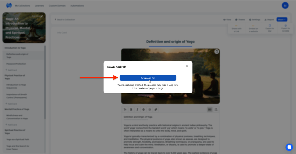 - In the next pop-up, wait for a while for your mini-course to be exported to a PDF file. When your file is ready, click on the “Download PDF” button to download your mini-course in PDF format.