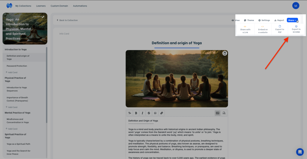 - To download your mini-course by exporting SCORM package, choose “Export to SCORM” option after you click on the share button. We support the editions SCORM 1.2 and SCORM 2004 3rd. After picking the desired edition, click on the download button just below to download the mini-course in SCORM format.
