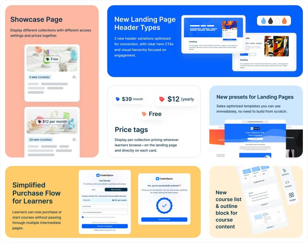 - Las páginas de aterrizaje de minicursos y colecciones son ahora totalmente personalizables. Ahora puedes incluso cambiar la posición de los esquemas de los cursos, eliminarlos por completo y tener total libertad de diseño en tu página de escaparate.