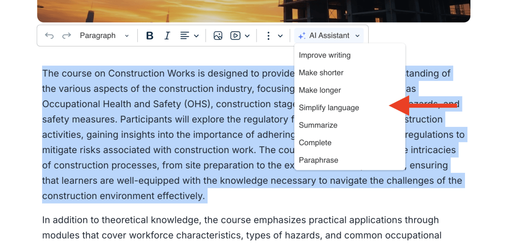 Go to your Mini Course’s edit page and select a text block to enhance. You will see In-Page AI Assistant option on editor.