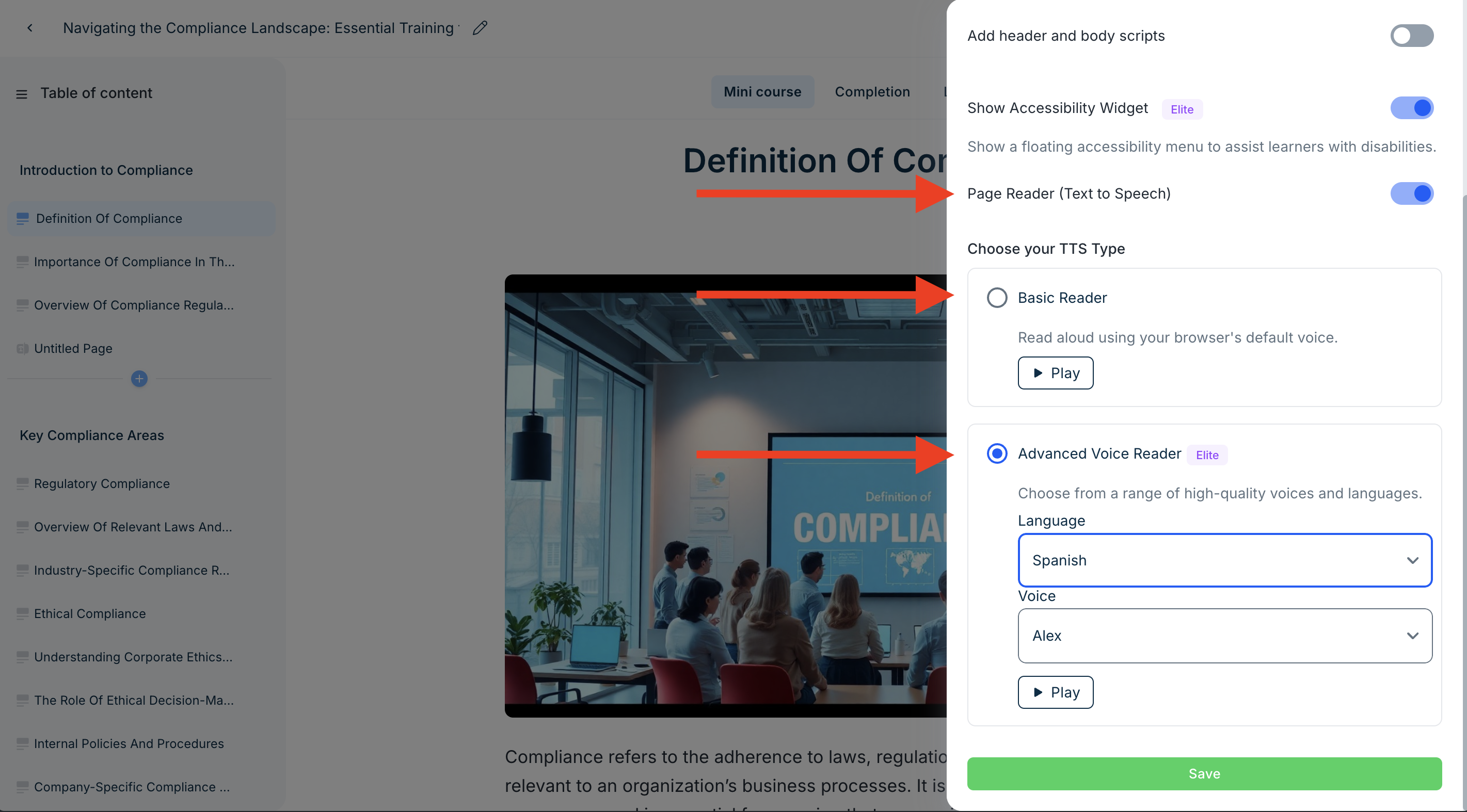Once configured and saved, Text to Speech will be automatically added to all your course pages.
