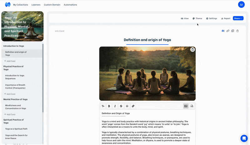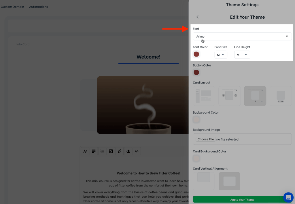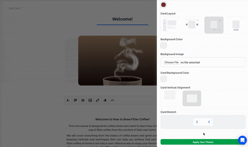 We all know that content is the king. Yet, the way your mini-course looks is also a part of your communication and branding. In order to make mini-courses more coherent with your marketing needs, you can customize your mini-courses’ design with various options. These options include different card layouts, themes, fonts, font sizes, colored backgrounds and other choices related to appearance.