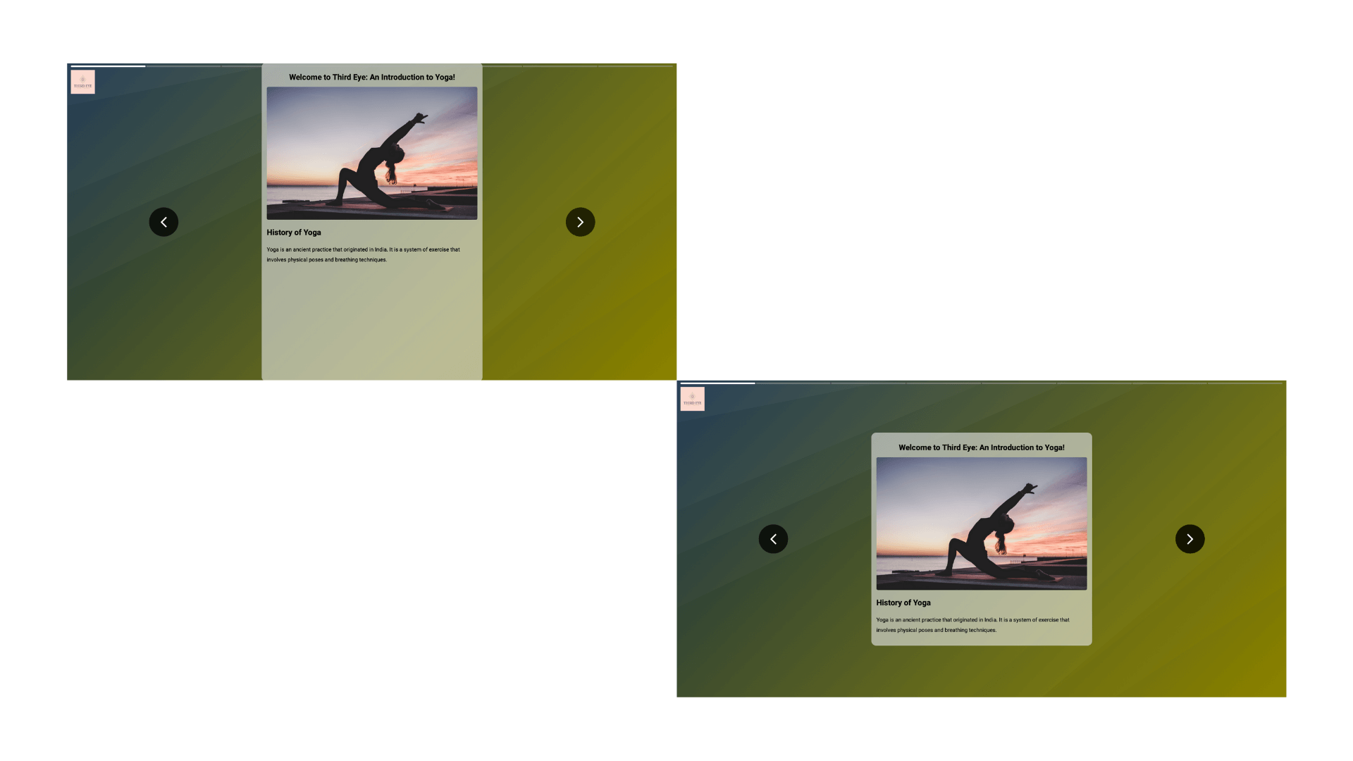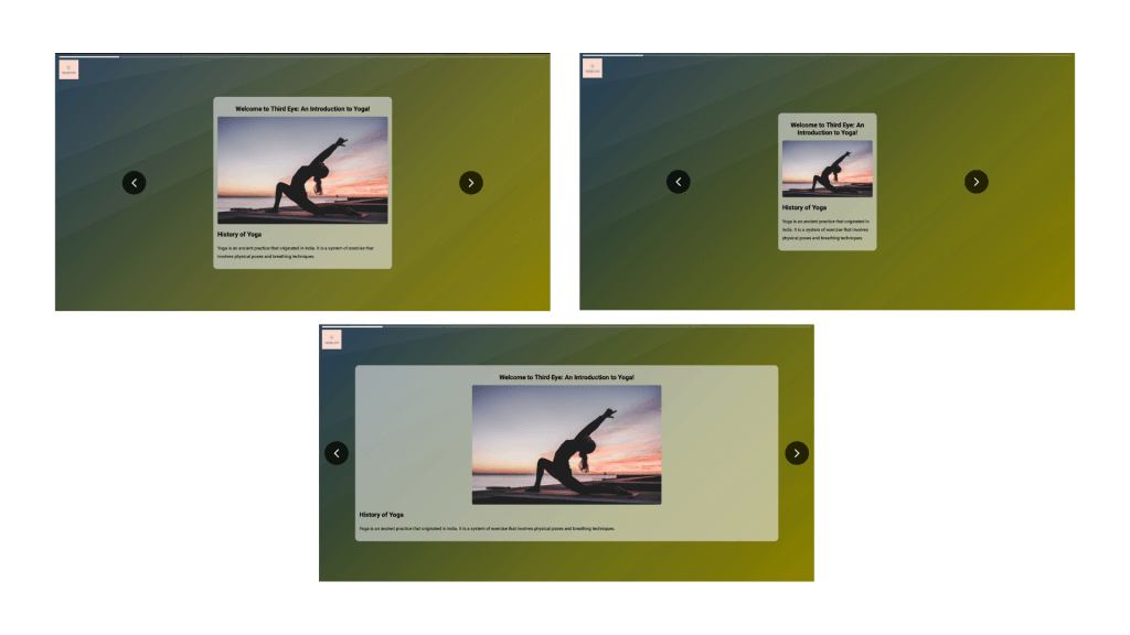 In the first layout, your learners can use the button on top left to see or hide the navigation panel. The next card button is at the bottom of the page.