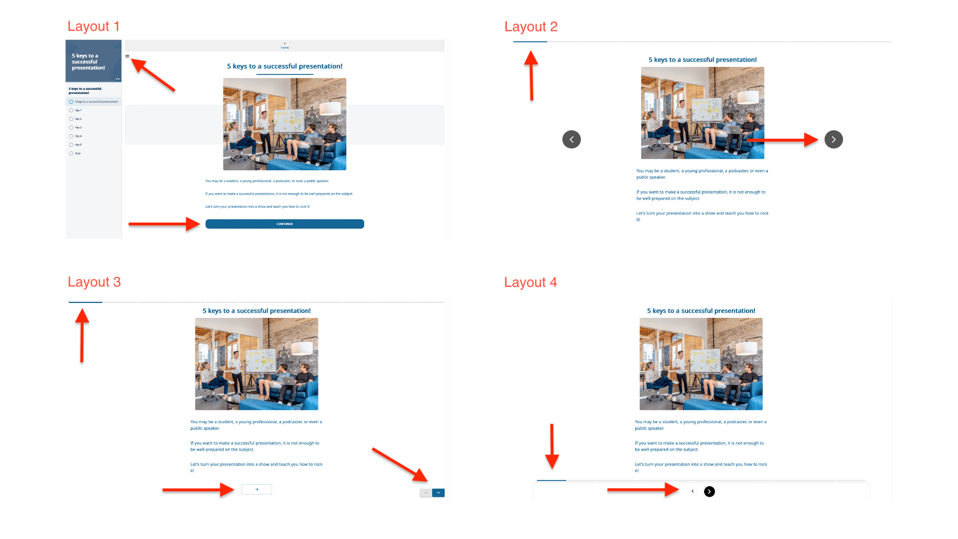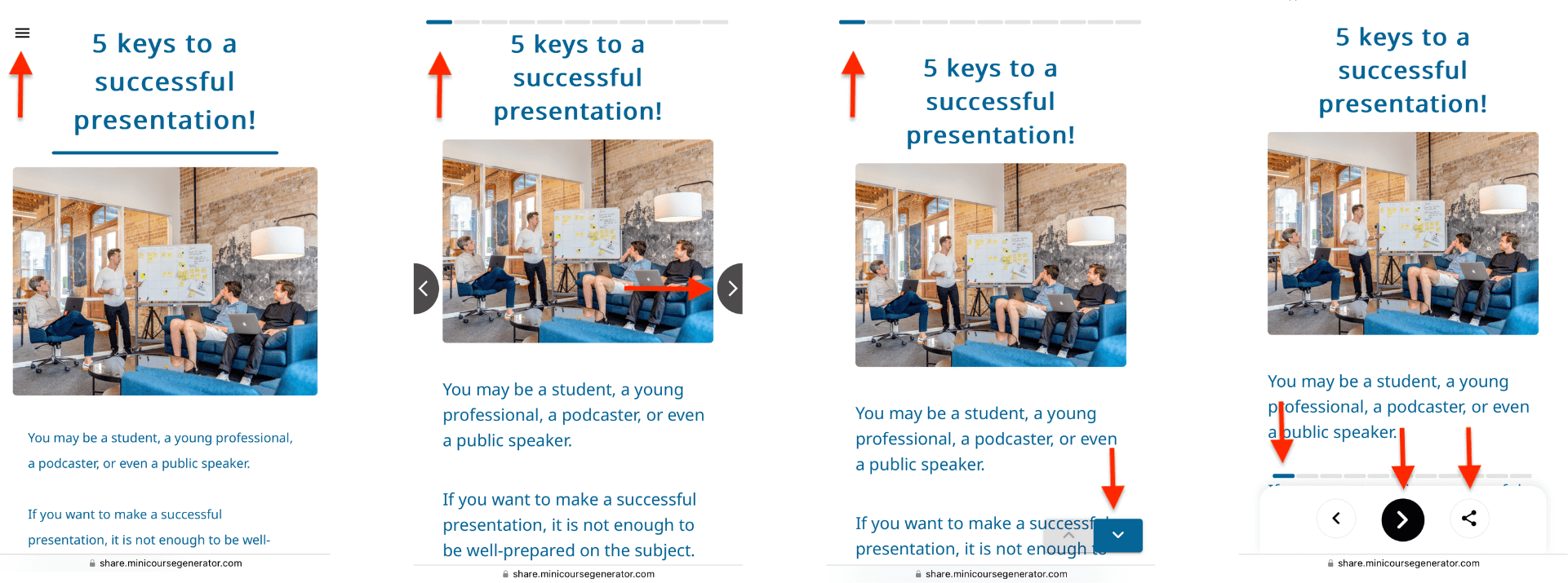 There are four different mini-course card layouts you can choose from. Each card layout has a different placement for the next card button and the progress bar. The choice you make will be valid for both computers and mobile devices, whether embedded in a webpage or not.