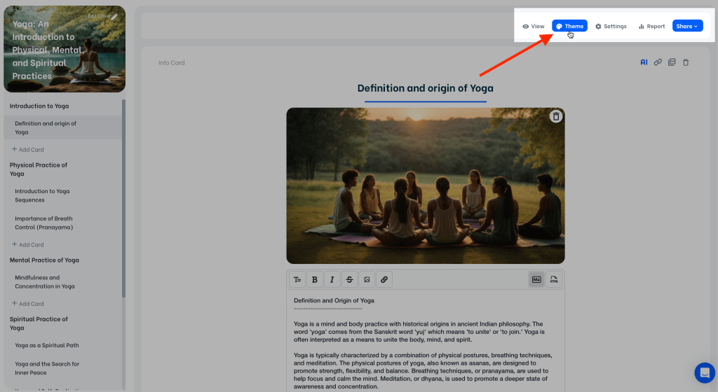On your mini-course editor screen, click on the “Theme” button, which is located on the upper right corner, to see features about layouts and customization.