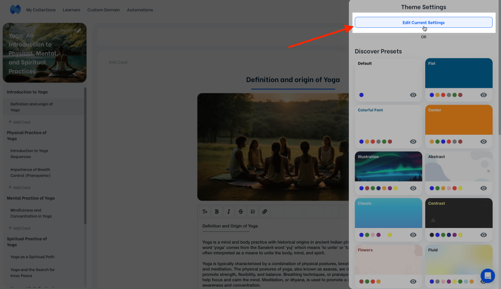 Theme presets are provided for your ease. Yet, not picking a theme preset at all is also an option. You can start customizing your mini-course directly by clicking on the “Edit Current Settings” button. These settings include several options regarding layout, fonts, backgrounds, card options, etc.