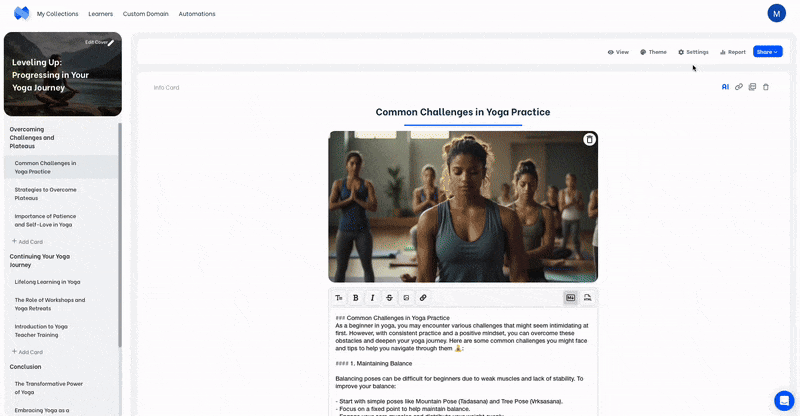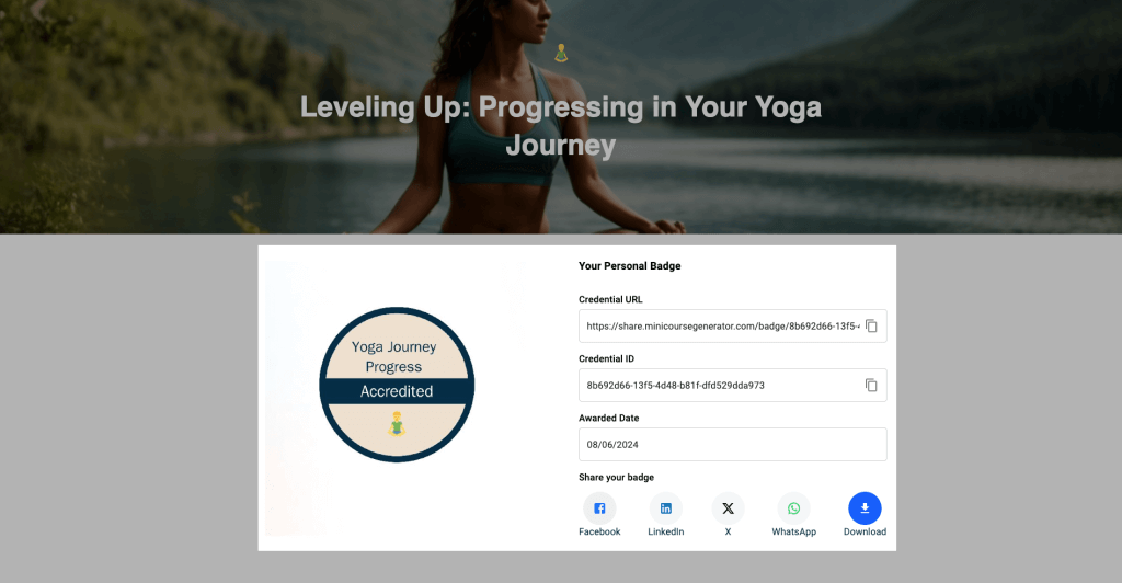 Badges are the icing on the cake for your mini-courses! Using a badge card in your mini-course, you can reward your learners with a proof of completion or success. Increase motivation, participation and engagement by rewarding your learners and reach higher visibility for your mini-courses with the help of easily shareable badges! With Mini Course Generator, all these perks are lightning-fast and practical as usual.