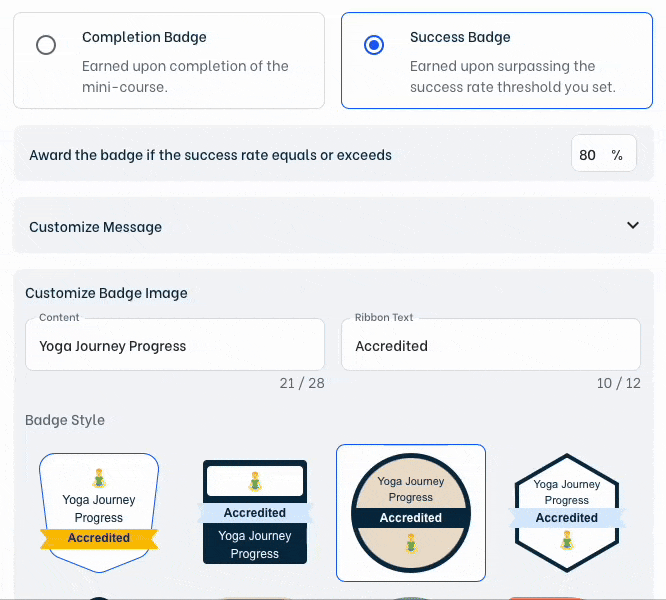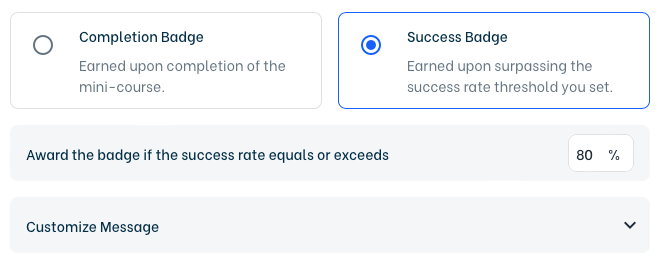 By default, a badge card rewards your learner for completion of mini-course. If you’d like to reward learners above a success threshold, choose “Success Badge” and set a desired percentage for success threshold as shown in the image below.