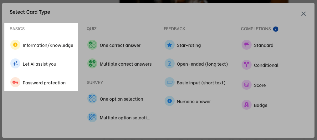 Suppose you do not desire any kind of activity on a card, such as quizzes, ratings, inputs, gateways, etc. Then an Info card would suffice as it is the simplest card type. Yet, it can still be enriched with media and PDFs, just like any other card.