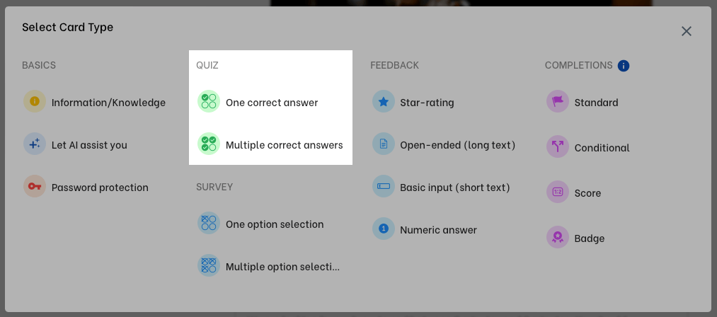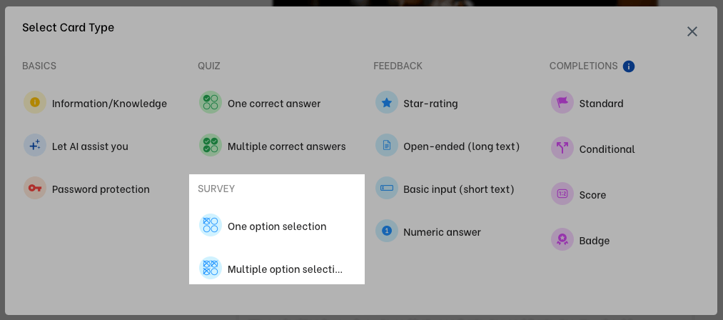 When your question does not necessarily have a correct answer, you can use survey type one option selection or multiple option selection cards.