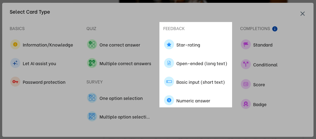 The cards under this section are great for getting feedback from your customers. These are star rating, open-ended, basic input, and numeric answer cards.