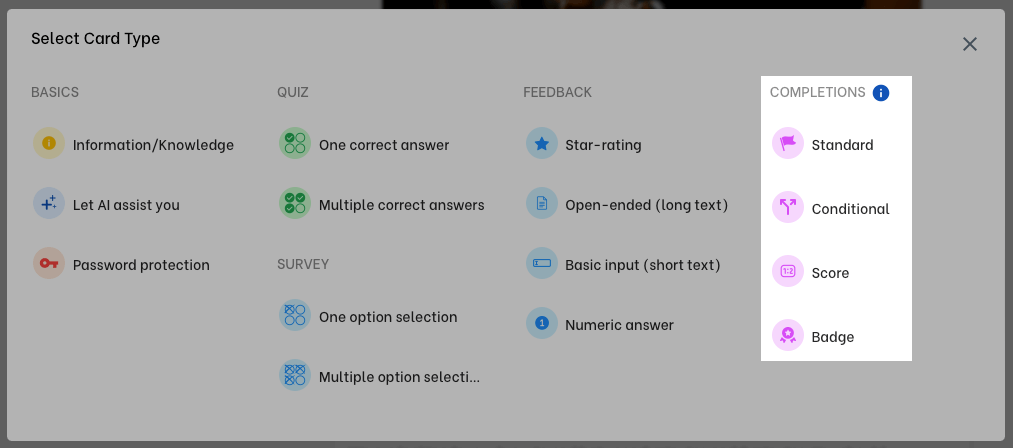 Besides, to end your mini-course customized for special purposes, such as conditional results, displaying scores or badges, you can use other completion cards. There are 3 types of special completion cards; which are conditional cards, score cards and badge cards.