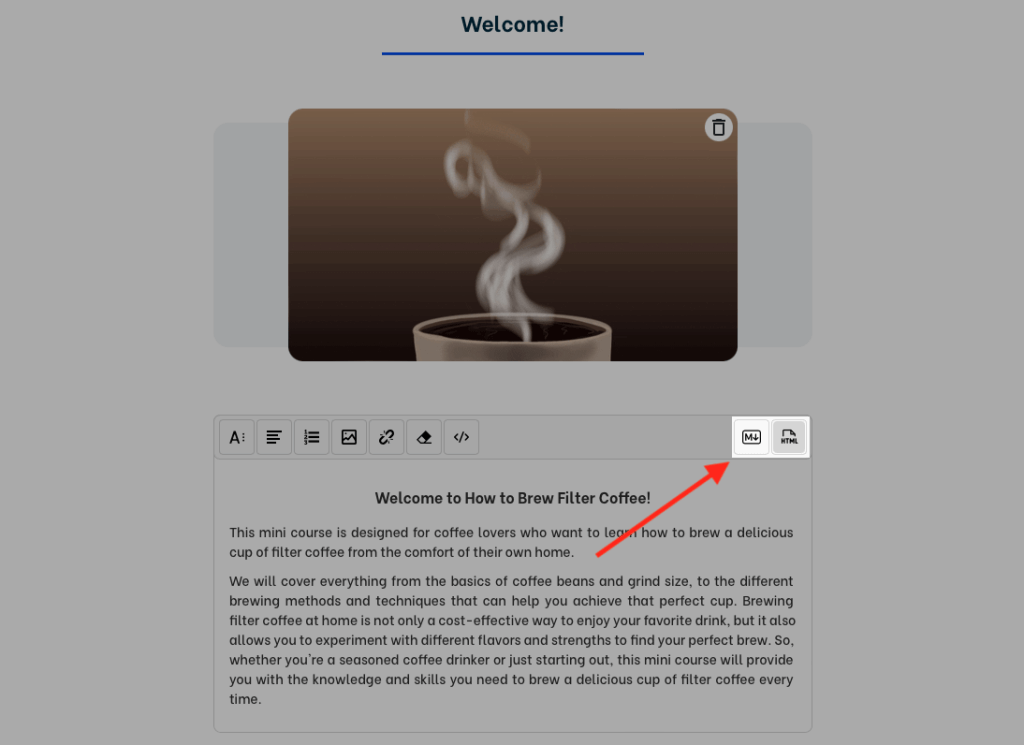 Two editor options are available at your service: Markdown or HTML. Change your editor by simply clicking on your choice.