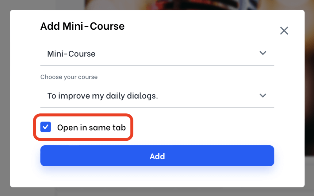 Note: When learners click on the link, it will open in a new tab. To avoid that, you should choose “Open in same tab”.