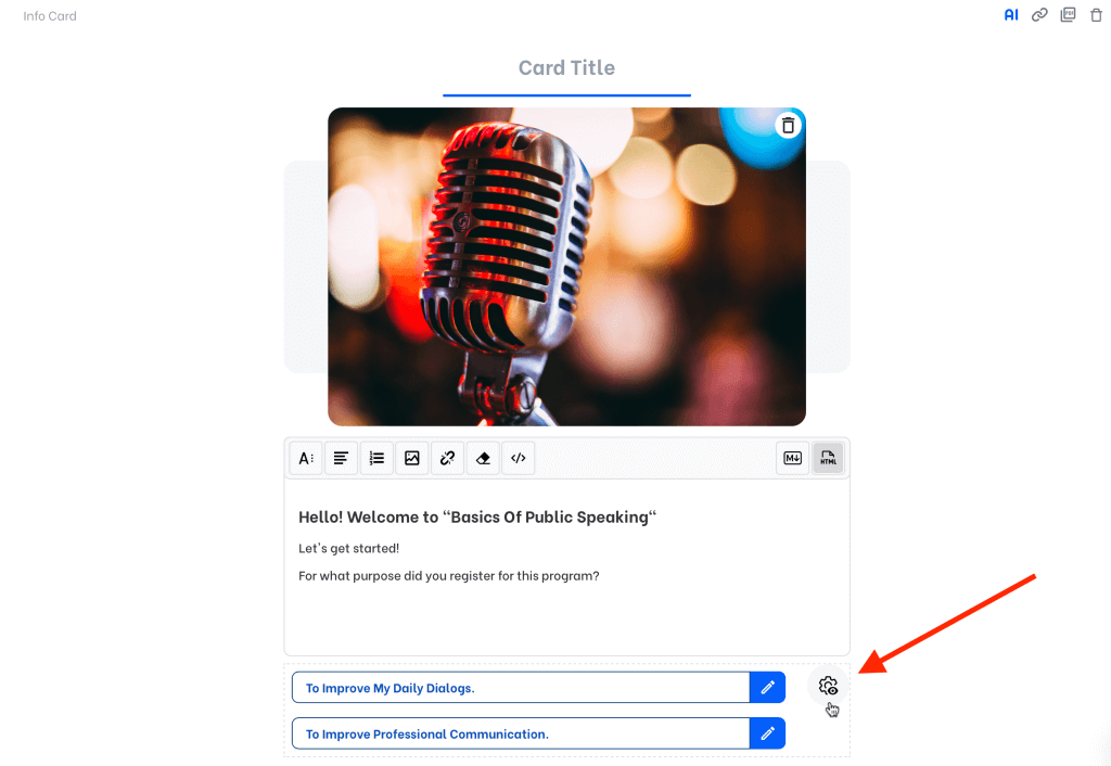 You can add as many options and mini-courses as you need. After you are done, click the settings icon at the bottom of the card. You may need to scroll down the card a little bit to see the links you have added.