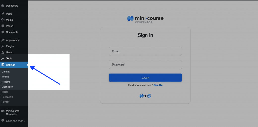 Click on “Settings” and log-in to your Mini Course Generator account.