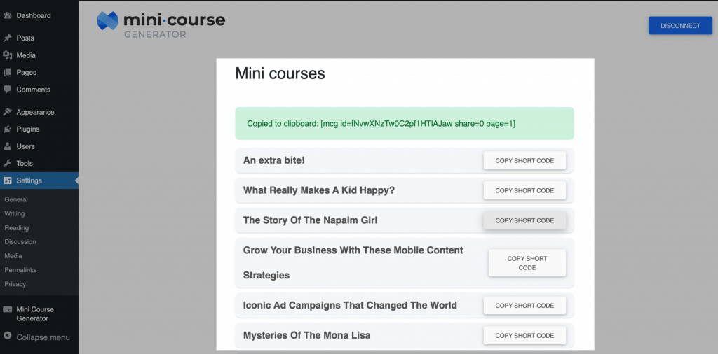 You will see a list of your mini-courses. Copy the short code of the mini-course that you want to embed.