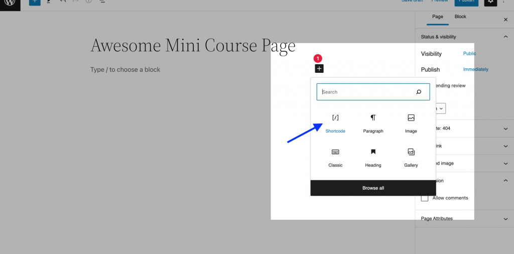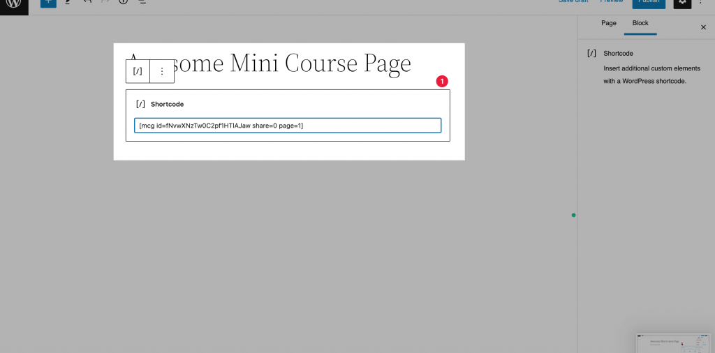Go to the page you want to embed the mini-course in. Choose the “shortcode” block type and place it to the area where you want to embed your mini-course in.