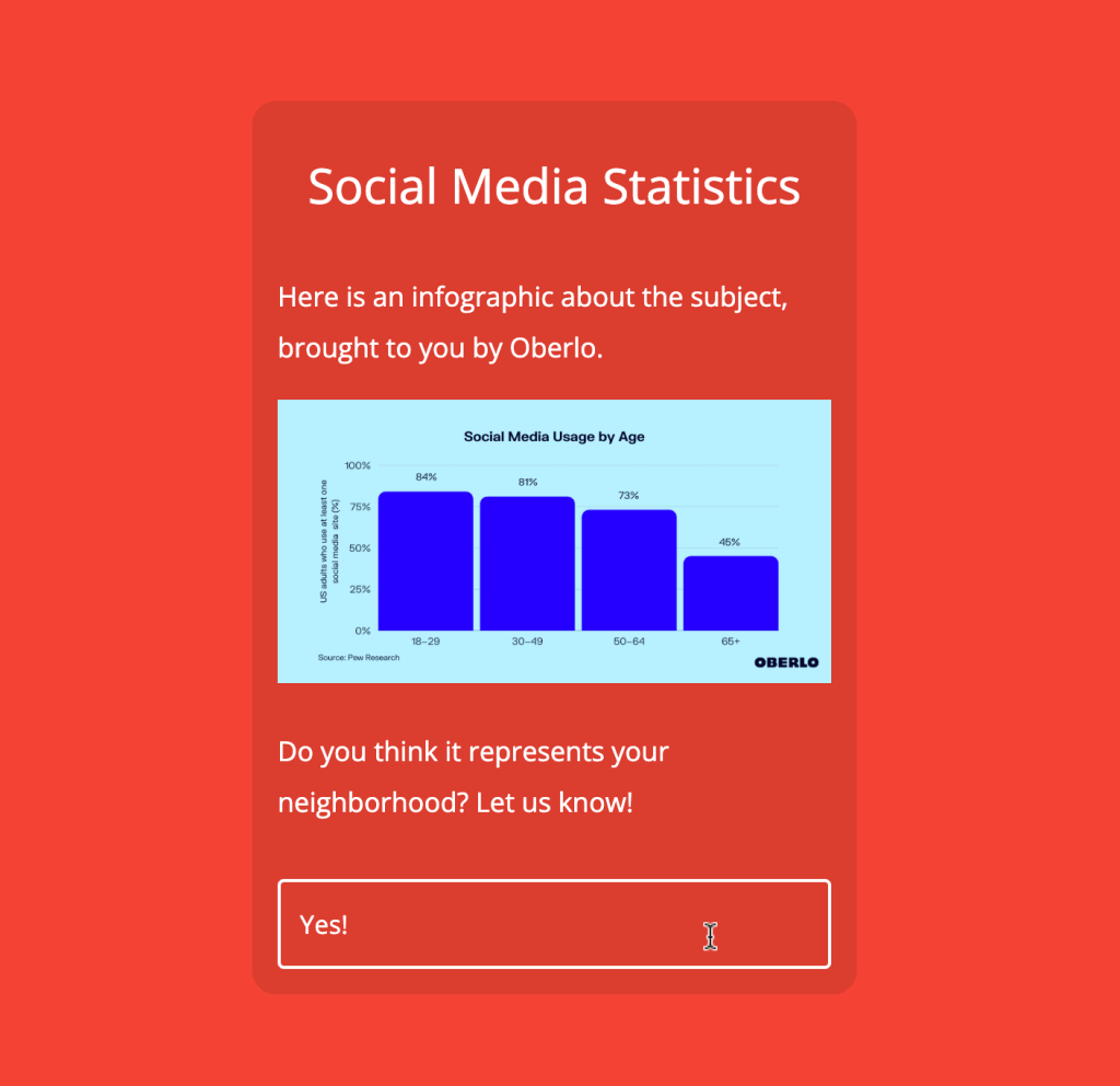 Puedes incrustar elementos visuales en tus minicursos con códigos HTML iframe y también hacer preguntas relacionadas con ellos. Así que, si quieres presentar una infografía, asegúrate de añadir debajo una pregunta tipo test o una encuesta para implicar más a tu audiencia.