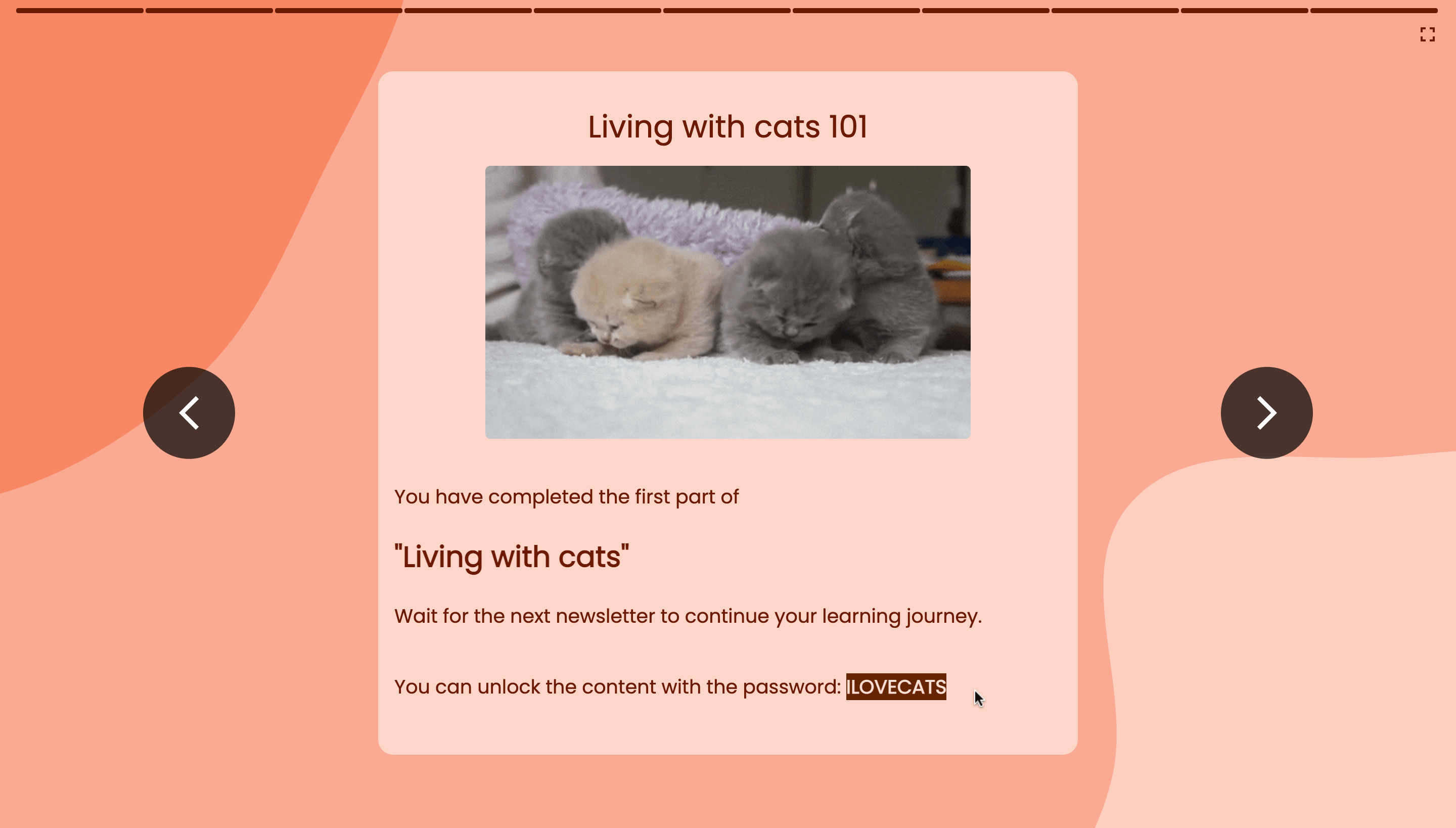 💡 En el Generador de minicursos no hay barreras de acceso para los usuarios finales. ¡Puedes dar acceso a tu minicurso directamente mediante un enlace! Aún así, es posible insertar una protección por contraseña o una pasarela de pago si quieres proteger tu contenido.