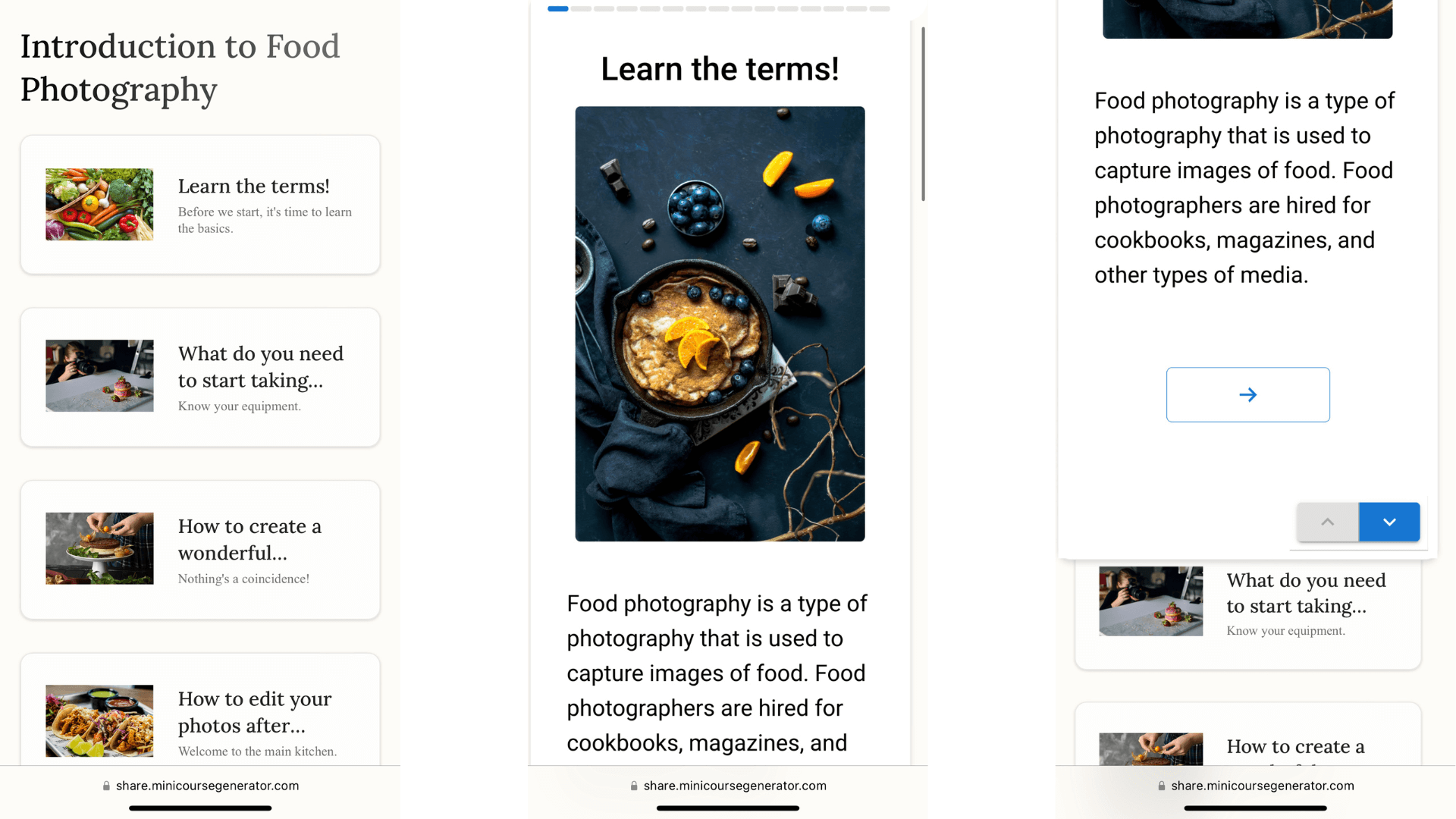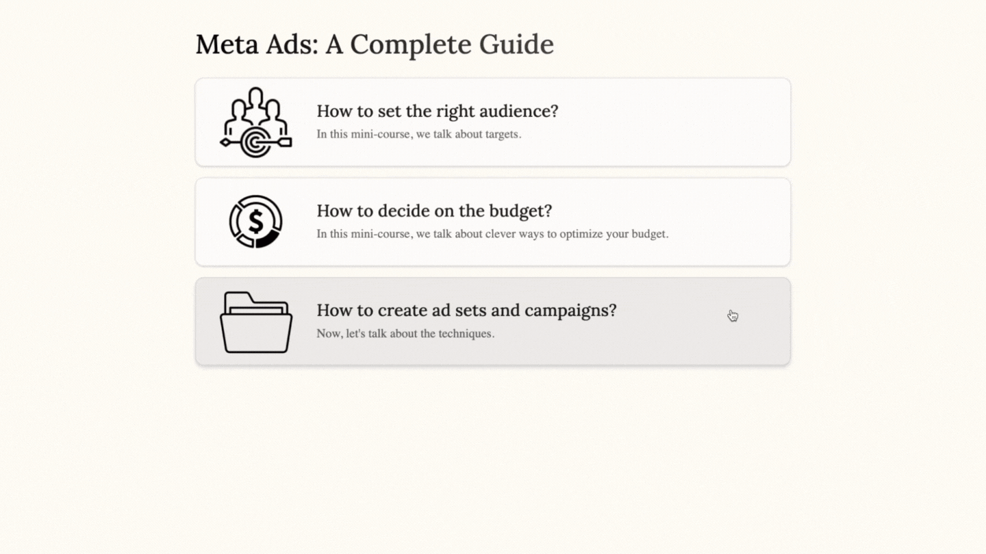 Los minicursos son herramientas maravillosas para compartir material educativo del tamaño de un bocado. Con un viaje de microaprendizaje, puedes captar la atención de tus clientes potenciales, nutrir tu comunidad, despertar la curiosidad entre tu público objetivo, crear la voluntad de empezar algo más grande e incluso cobrar por tu trabajo. Las colecciones de minicursos son aún mejores para presentar tu contenido de forma organizada, construir un viaje educativo con un orden significativo y crear un conjunto de materiales relevantes para diversos fines. Los usuarios finales no abandonan la página de la colección para ver tus minicursos, y exploran tu contenido siguiendo el índice que establezcas. Así, la experiencia del usuario es más completa y satisfactoria. Incluso puedes crear una página de aterrizaje o una página de enlace en biografía con tu colección de minicursos. Si vendes tus conocimientos, cobrar una vez por varios minicursos es mucho más fácil con las colecciones.