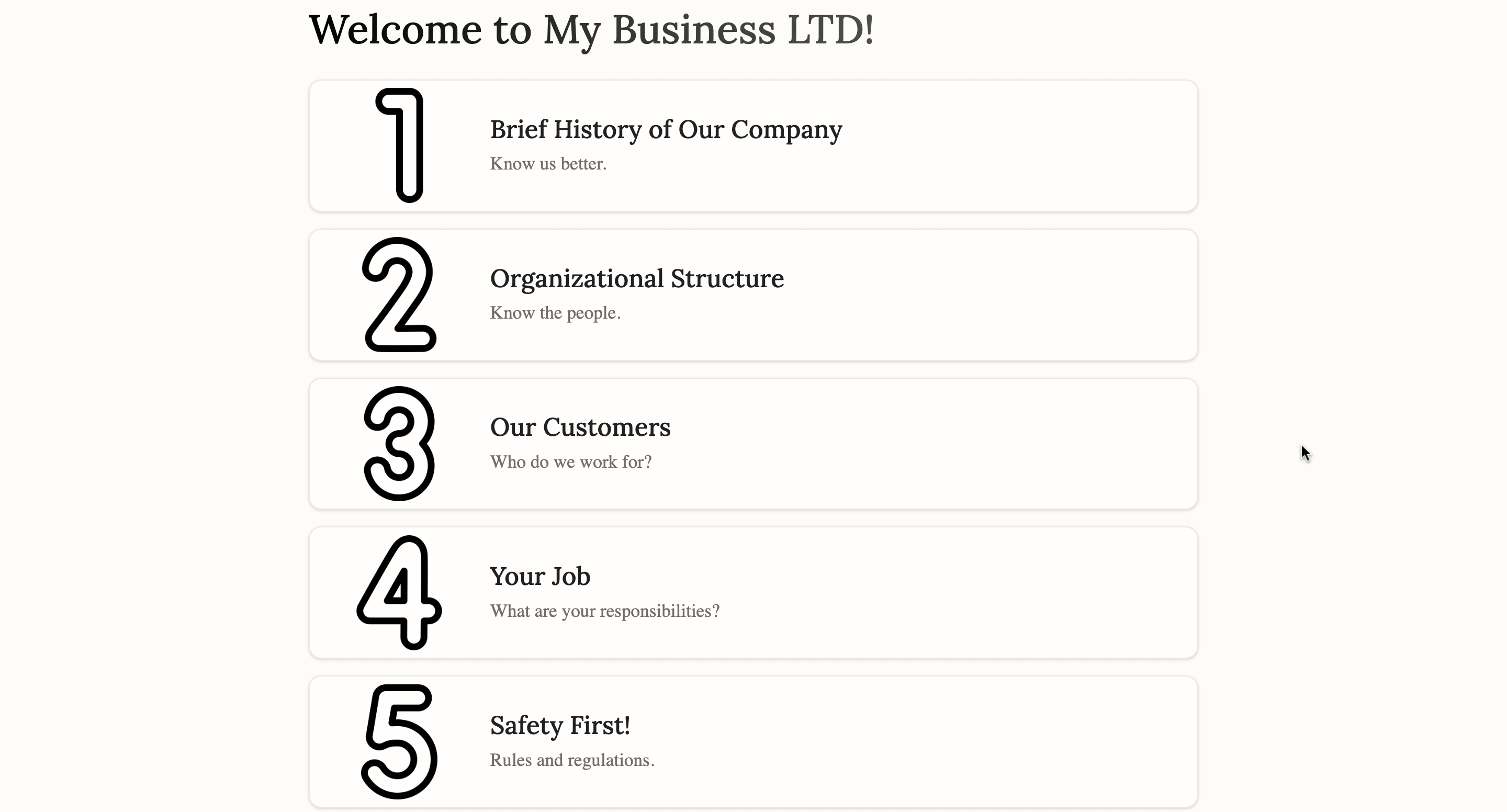 Ejemplo nº 4: Eres especialista en recursos humanos y quieres crear un programa de incorporación para nuevos empleados como éste: