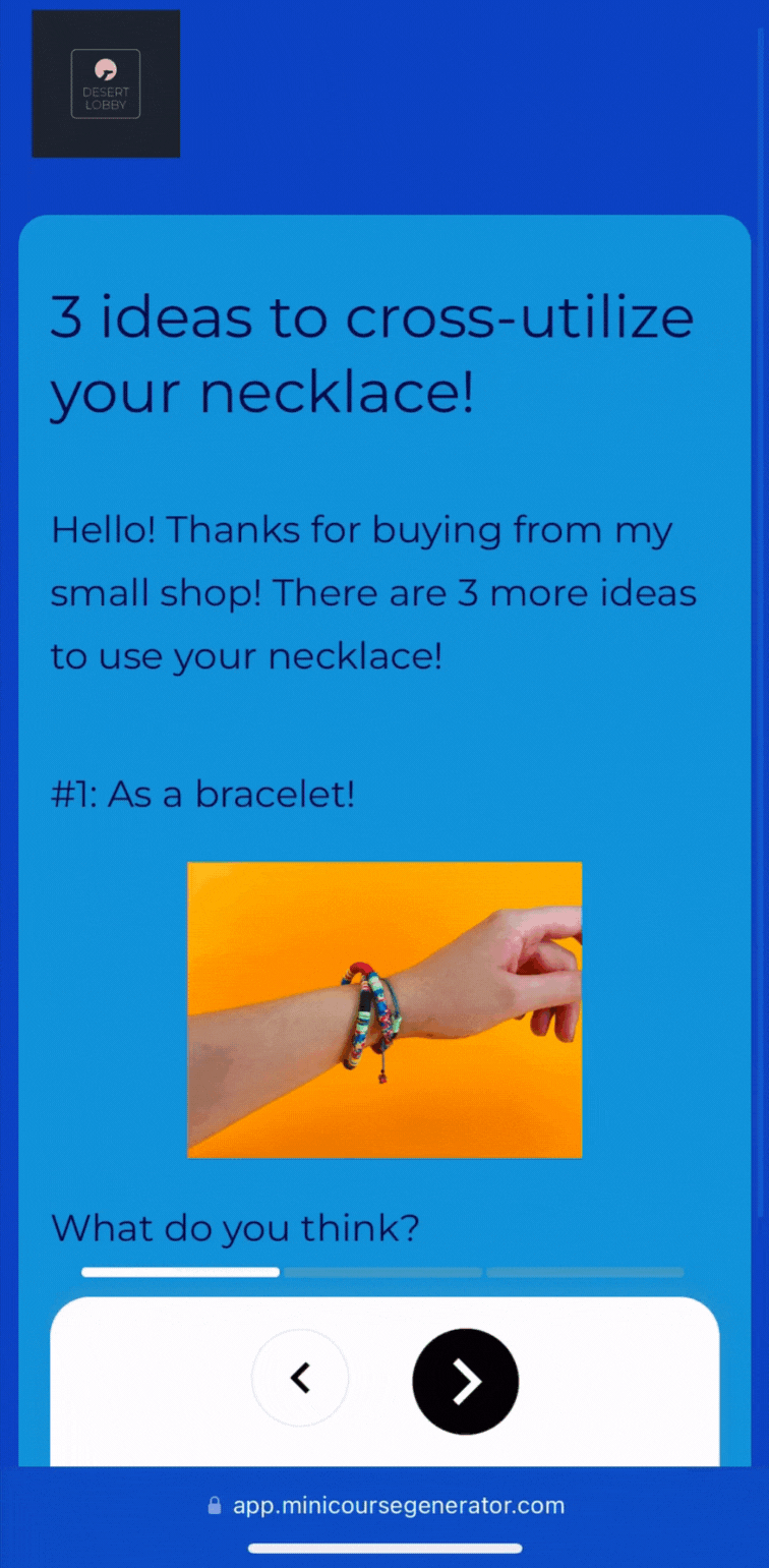 ¡Idea de minicurso nº 4 fácil de crear y atractiva! Supongamos que vendes collares hechos a mano. Crea un minicurso titulado «Hazlo tú mismo: ¡una pulsera perfecta a juego con tu collar!» y añade un muro de protección con contraseña al principio. Sólo podrás enviar la contraseña a los clientes que hayan dejado reseñas en tu tienda. Puedes gestionar las pasarelas fácilmente con el Mini Generador de Cursos.