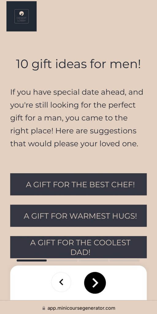 ¡Idea de minicurso nº 5 fácil de crear y atractiva! Prepara un minicurso titulado «10 ideas de regalos para hombres» para conseguir tráfico durante la temporada de San Valentín o el Día del Padre. Puedes añadir un botón CTA al final que dirija a tu tienda Etsy. Puedes añadir y personalizar atractivos botones de enlace en el Generador de minicursos.