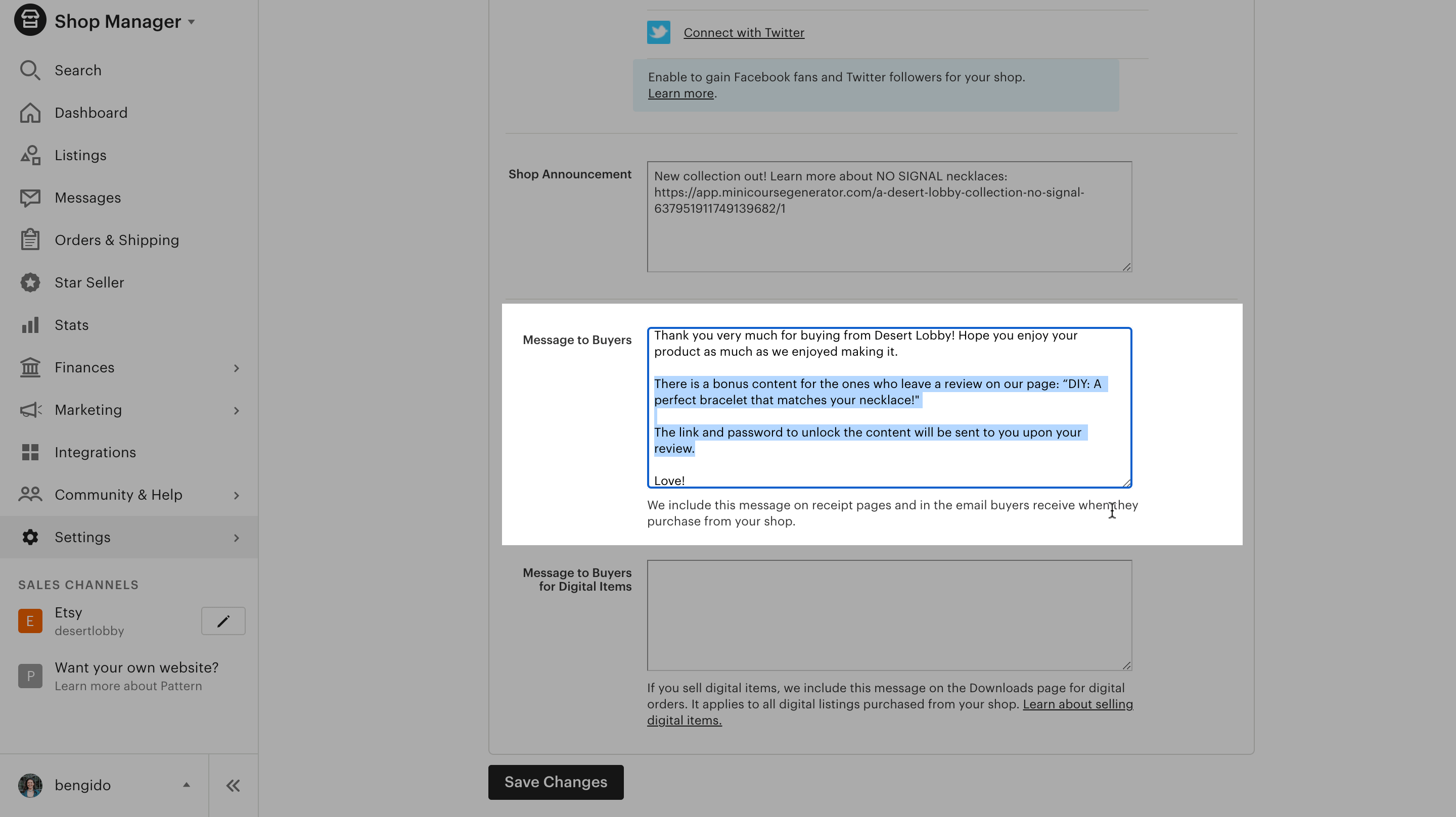 Tu perfil de Etsy también puede hacerse más interesante añadiendo contenido exclusivo que los clientes sólo puedan ver si dejan una opinión en tu tienda. Todo lo que tienes que hacer es presentar tus conocimientos como un incentivo para animar a los clientes a dejar una opinión en tu tienda de Etsy e indicarlo en tu correo electrónico de agradecimiento.