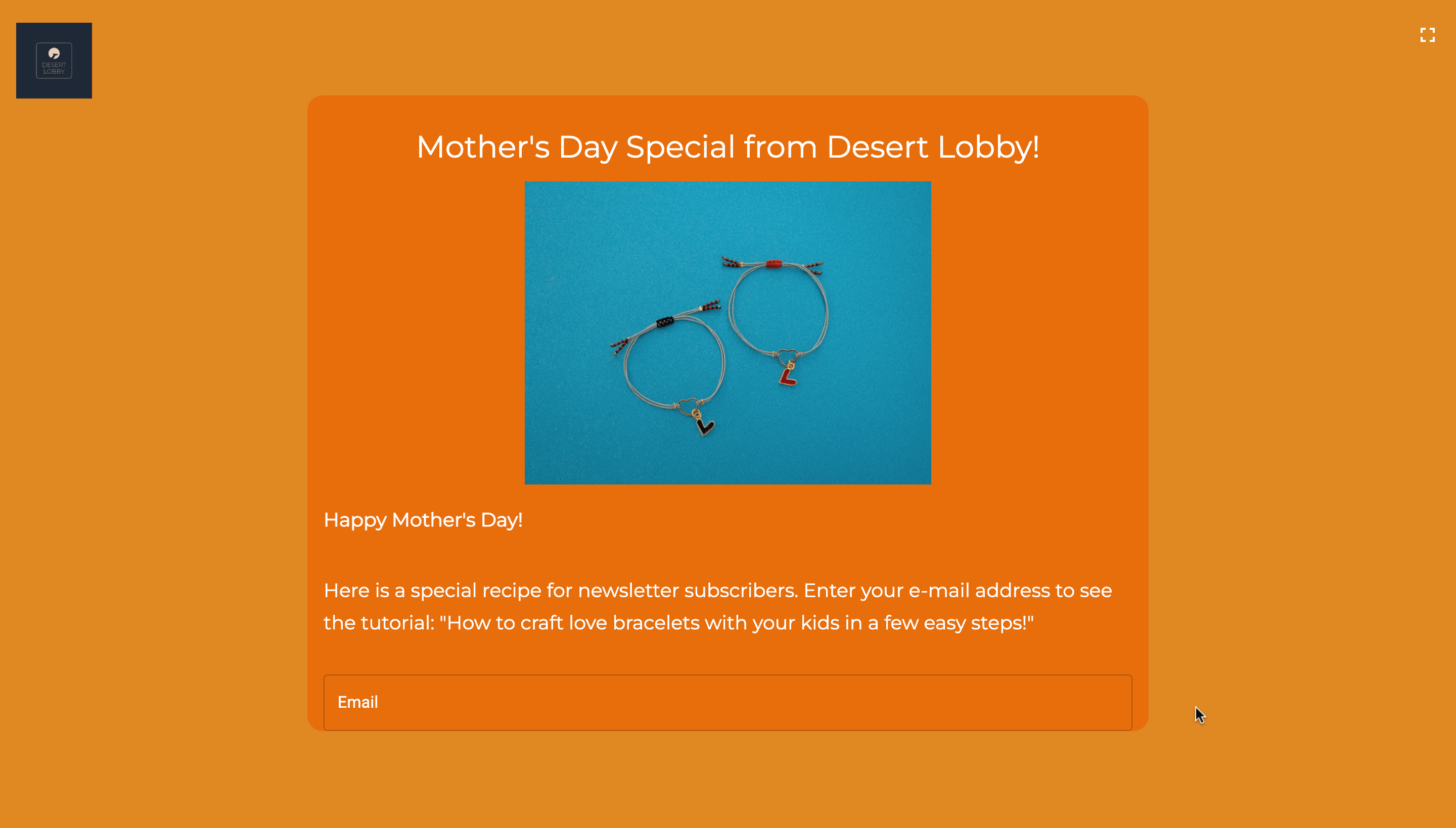 ¡Idea nº 2 de minicurso fácil de crear y atractivo! Crea un minicurso titulado «Especial Día de la Madre: haz pulseras del amor con tus hijos en unos sencillos pasos». Coloca un muro de inscripción al principio y recoge los correos electrónicos de las personas interesadas. El Generador de minicursos ofrece varios flujos de trabajo para automatizar las suscripciones a tu boletín.