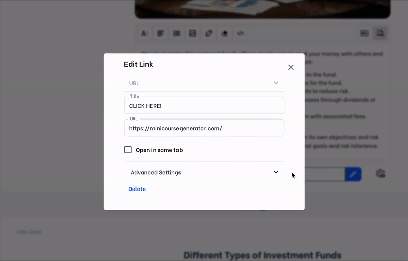 When learners click the link, by default it opens in a new tab. To avoid that, you can choose “Open in same tab”.