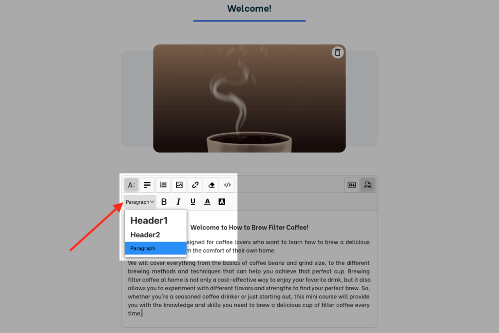 For the body text, there are 3 formats available: Header 1, Header 2, and Paragraph.