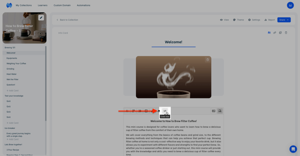 In any type of content card, you can open the HTML code viewer by clicking on the code tag icon located in the formats bar.