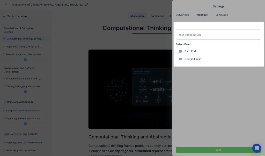 From adjusting the learner flow to integrating advanced tools, Mini Course Generator provides a wide range of customization options. You can control how learners progress through your course, receive notifications when a course is completed, and even connect with external tools using webhooks. With language support for more than 30 languages, you can also ensure your course is accessible to a global audience.