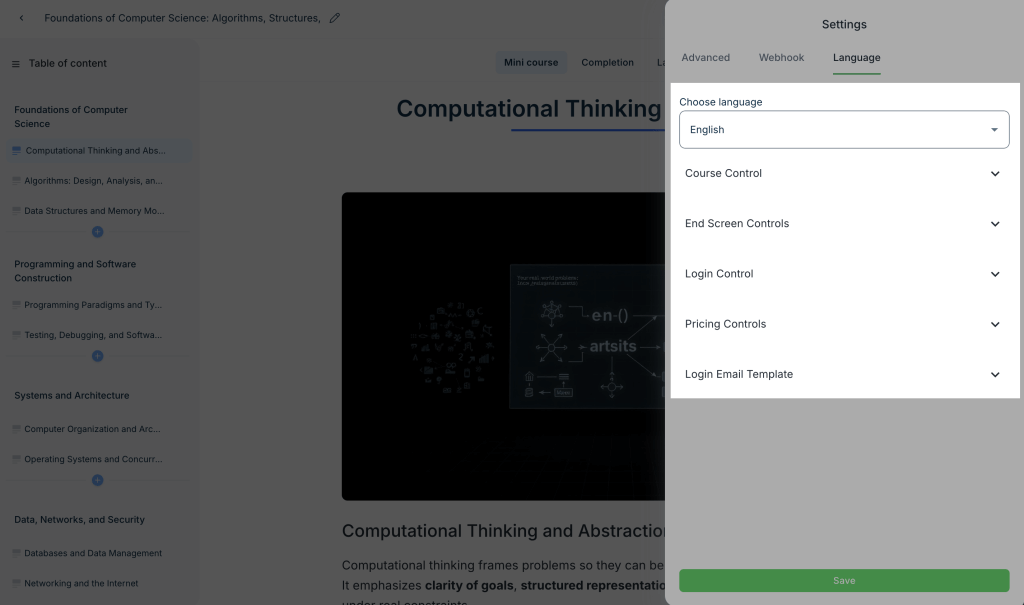 Under language tab, you can find supported languages under “Choose language”. After choosing your mini-course language, you can further customize the text displayed on mini-course buttons, login screens, confirmation emails and mini course last screen.