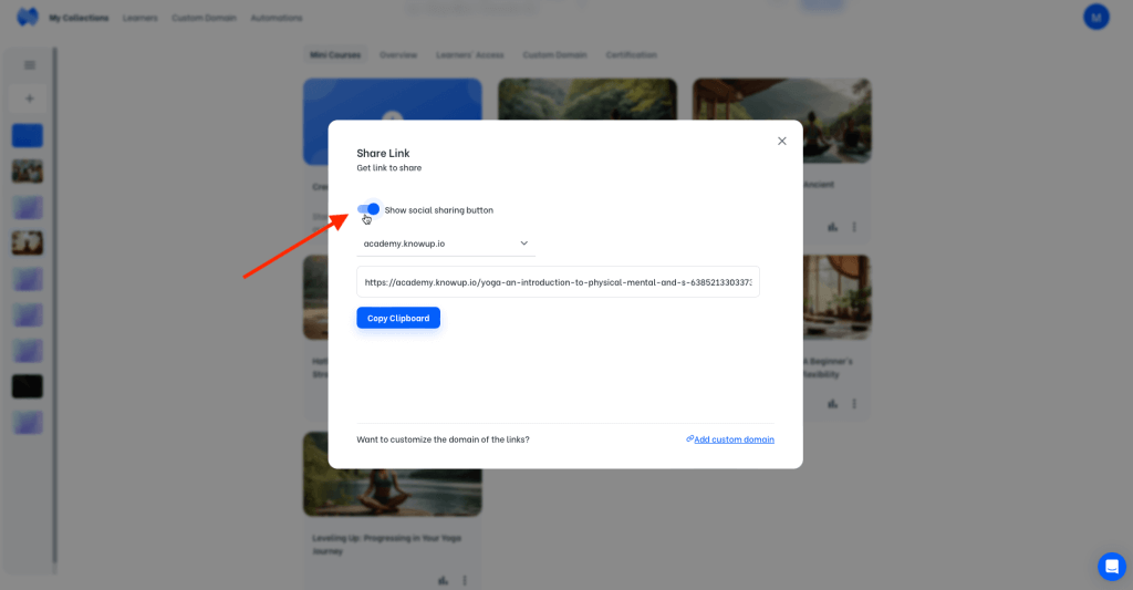 When you open “Share” menu, you can see the share link of that mini-course. If you want to display the social sharing button on your mini-course, make sure that the related option is activated.