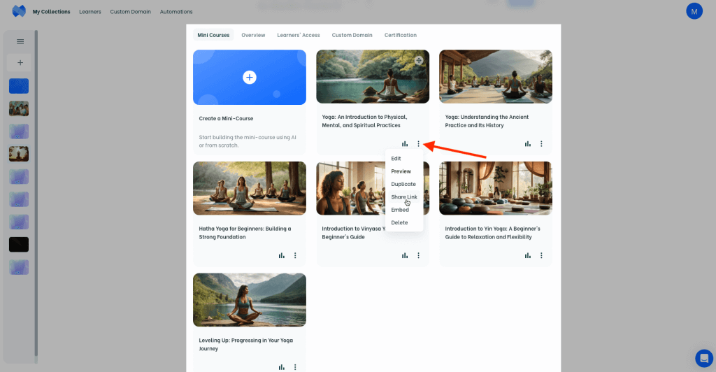 You can also reach “Share” command from your admin dashboard as well, under the dots menu of a mini-course.