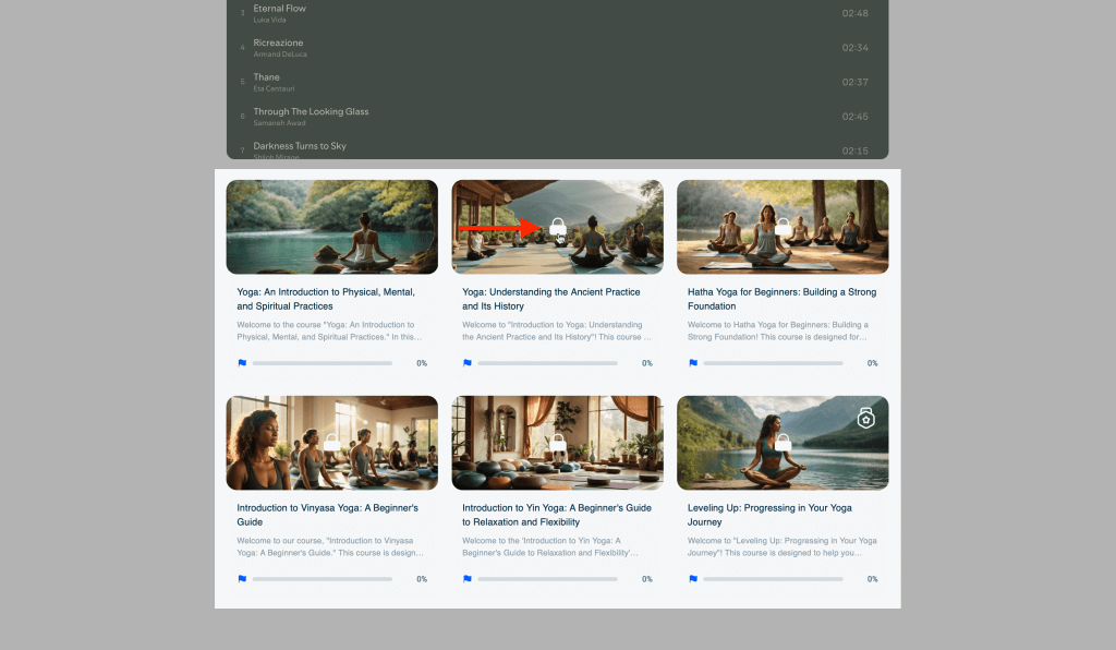 As shown in the image, a new learner will see all mini-courses in the collection except the first one with a lock icon, and clicking on the locked mini-courses will not open them, unless the unlocked mini-courses are completed.