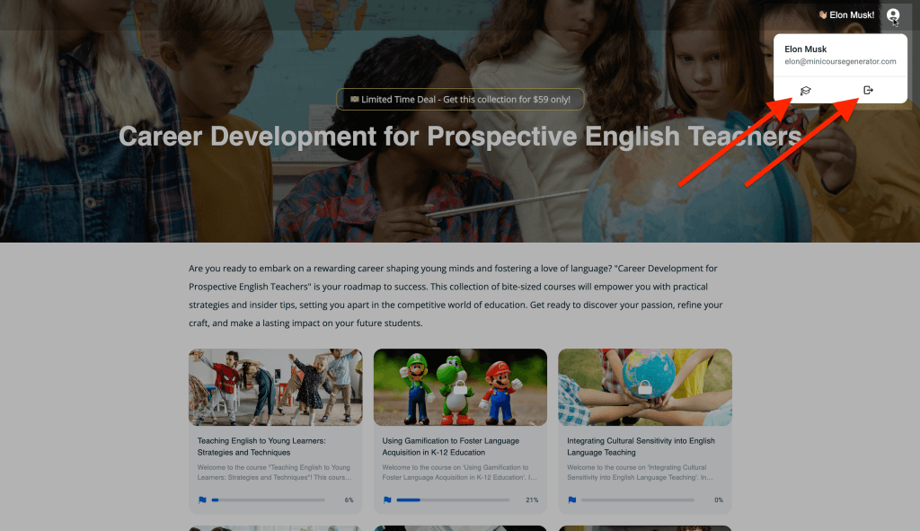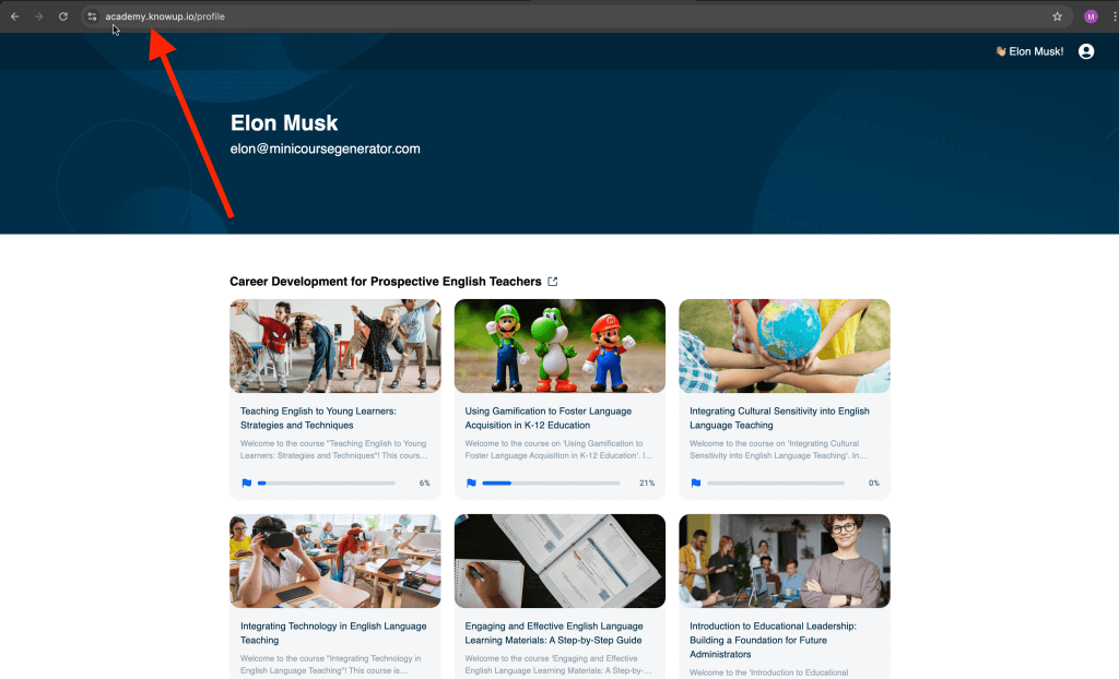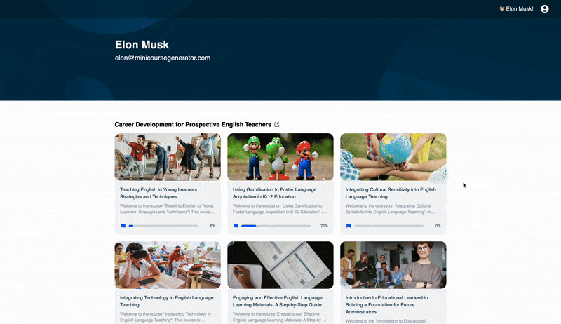 Although your learners do not need to create an account themselves to access content in Mini Course Generator, learners have a dashboard available where they can see all collections of mini-courses assigned to them at once.