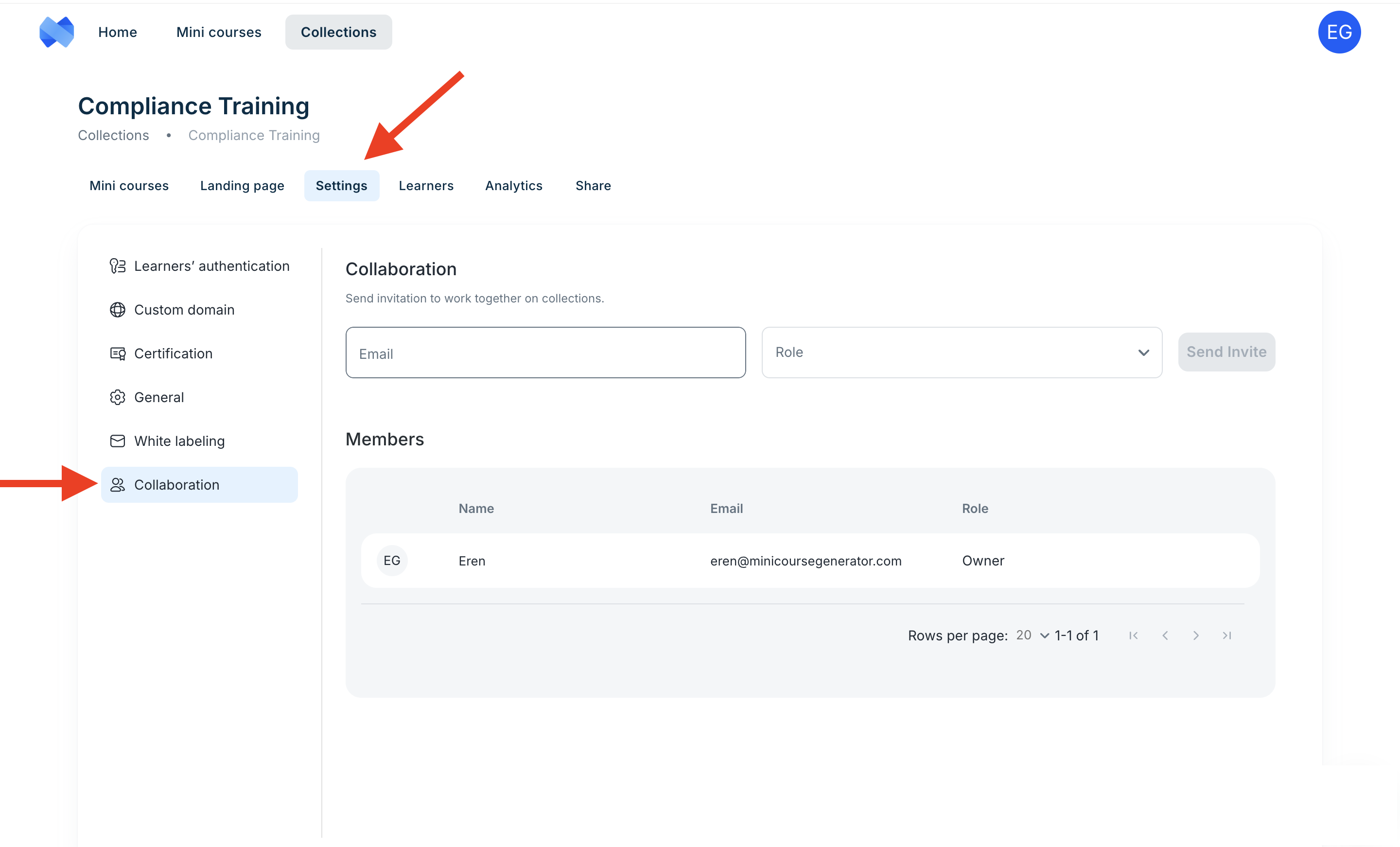 Mini Course Generator is designed to be a flexible collaborative elearning authoring tool. Whether you are an agency, a school, or a corporate training team, our platform allows you to invite users to your workspace (which is “collection” in our case), assign roles with different permissions, and co-edit courses. Below you will find guides on how to manage your collaborators and maximize your productivity in content creation.