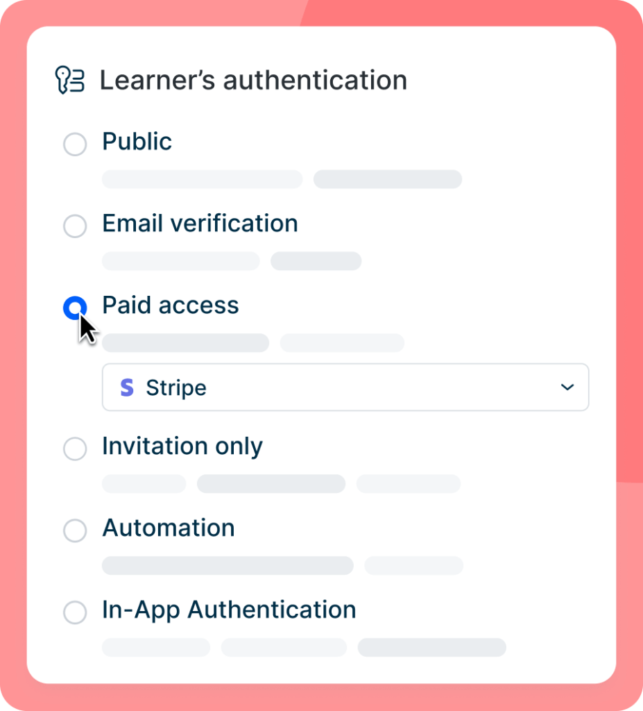 Ofrece acceso público sin inicio de sesión, añade pasarelas de pago, recopila correos electrónicos, concede acceso a alumnos concretos o acceso dentro de la aplicación mediante SSO.