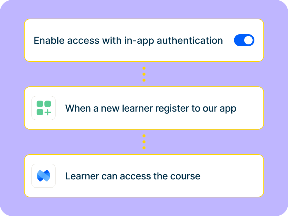 Permite a tus alumnos acceder sin problemas a los materiales de formación en las plataformas que ya utilizan, utilizando la autenticación en la aplicación o mediante automatizaciones con Zapier y Make. Elimina la molestia de nuevos inicios de sesión, contraseñas y la necesidad de descargar nuevas aplicaciones o recordar servicios web adicionales.