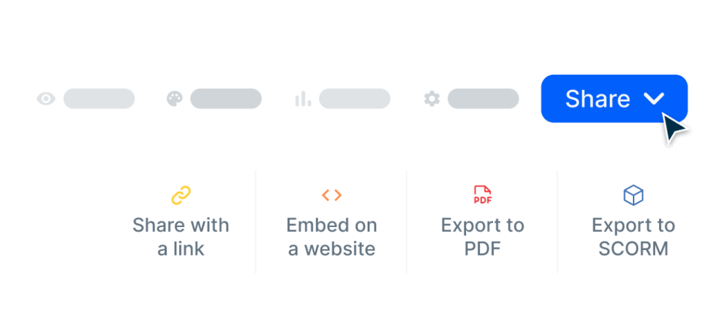 El Mini Generador de Cursos va más allá de ser un avanzado Creador de Cursos AI y una herramienta de autor fácil de usar. Descubre formas versátiles de distribuir tus contenidos educativos, desde incrustarlos en páginas web hasta compartirlos mediante enlaces, o exportarlos como SCORM o PDF.